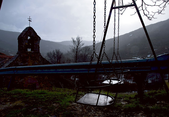 Al lado de la iglesia hay un columpio, oxidado, como el párroco, se ha quedado sin clientes que jueguen en él.