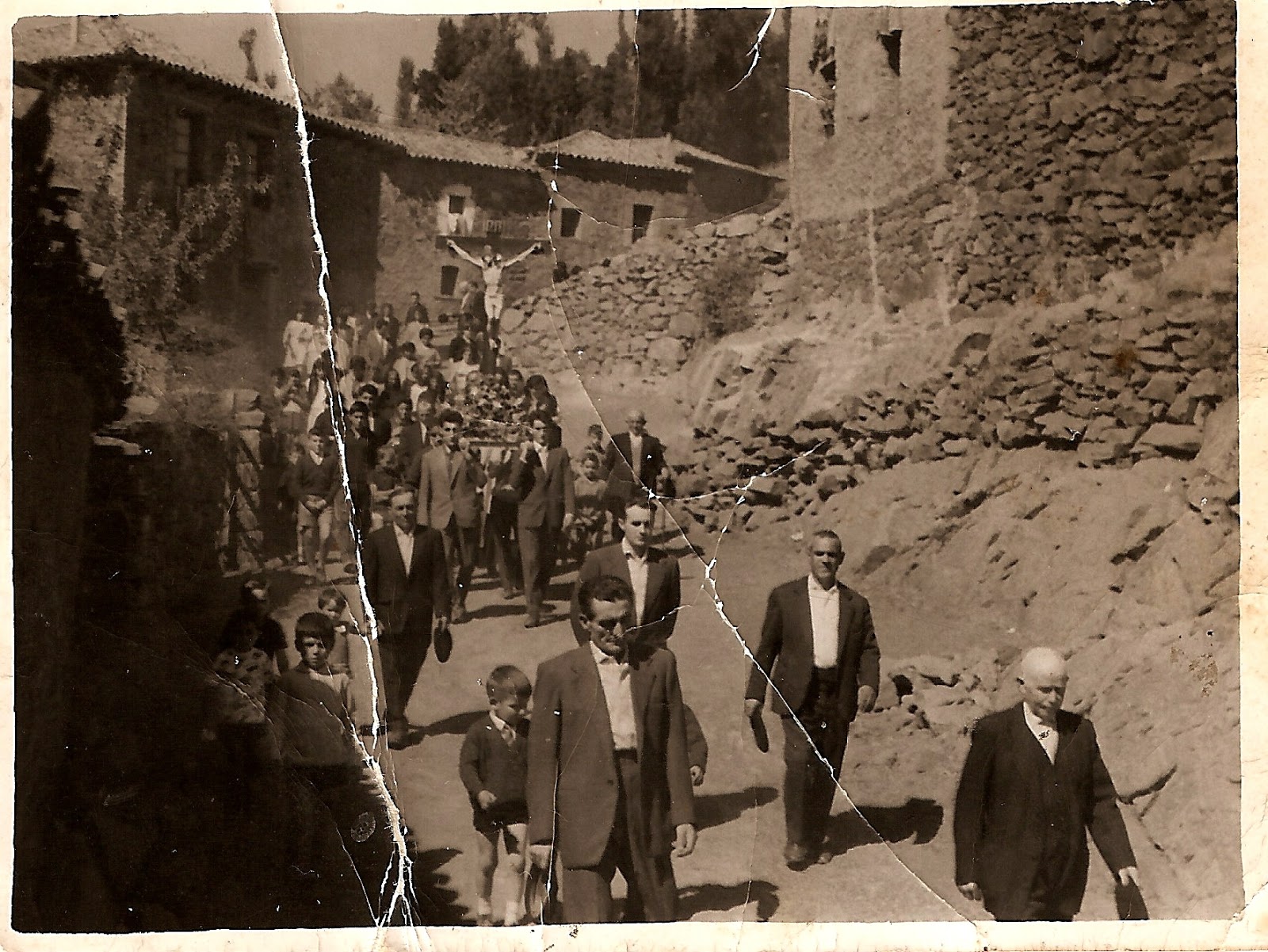 En esta foto se puede reconocer a los hombres que van delante del Cristo y que aparecen en primer plano son: Aurelio, Gerardo, Ángel, Isidoro, Eliseo que lleva a Begoña de la mano, y los dos que portan las andas son Marcelo y Luis, a su lado a la derecha está el tío Bello. De los niños que están a la izqda. se recone a Miguel (peinado a raya) y más atrás a Paco.