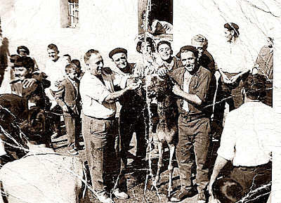 En esta foto se puede reconocer a "Chamuscas", a la izquierda (escribiendo), detrás de él están Tino, "El Jaila" y Lolo y Sindo, en el centro Genoveva, Manolita y Aurelina; el del tambor es "El Pitero" de Coladilla, y el que está sentado delante con una cesta es Vitorino "Casina".