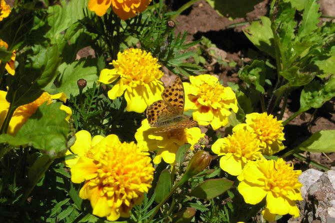 Unas flores preciosas y una mariposa.